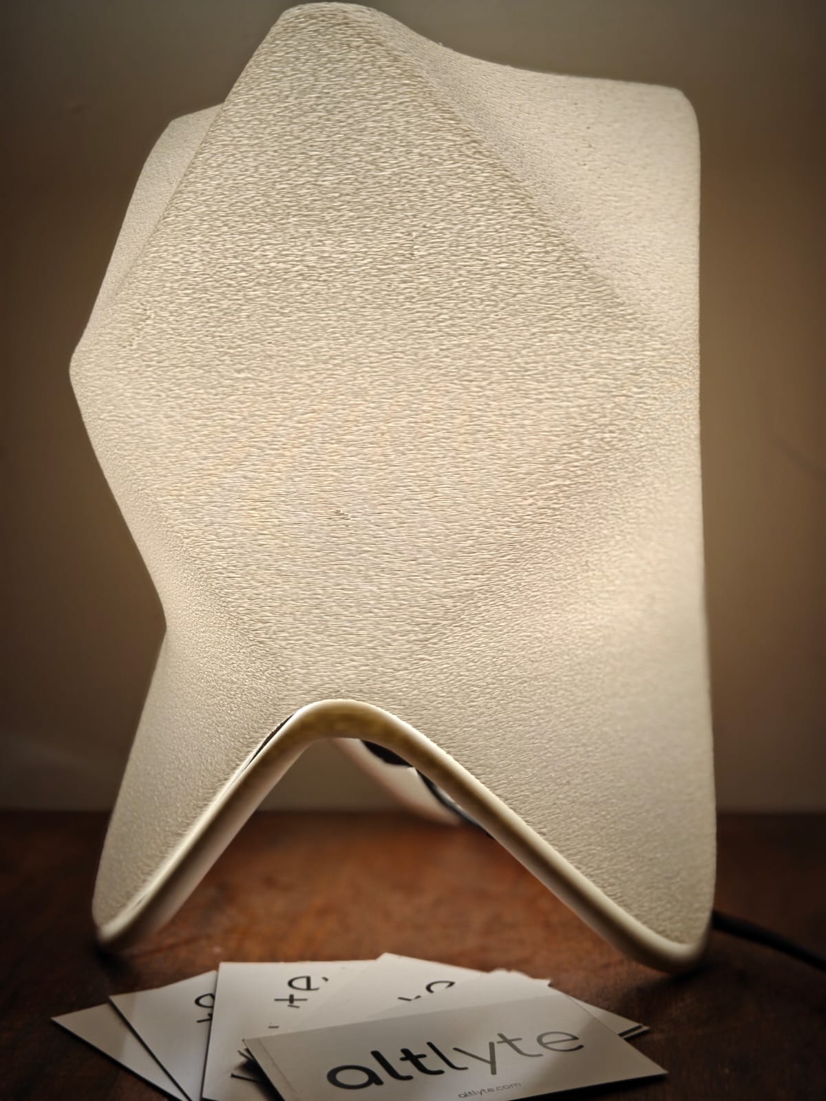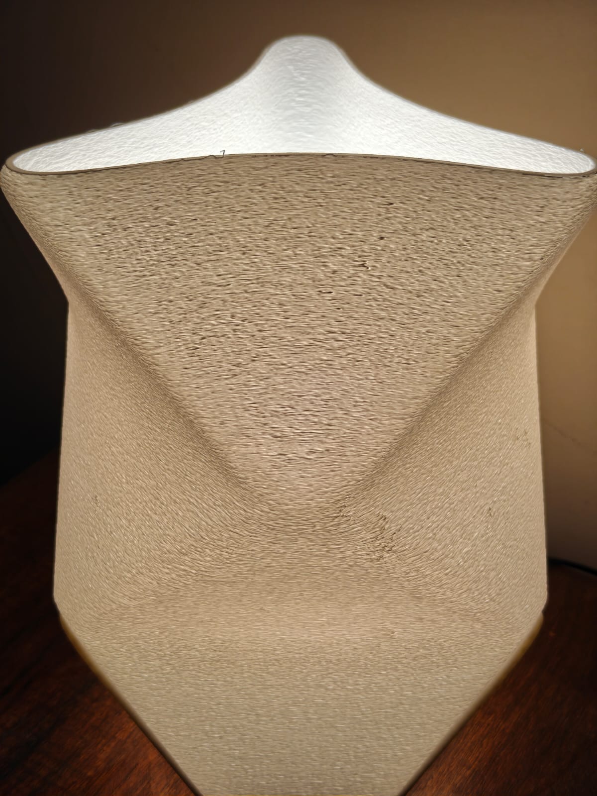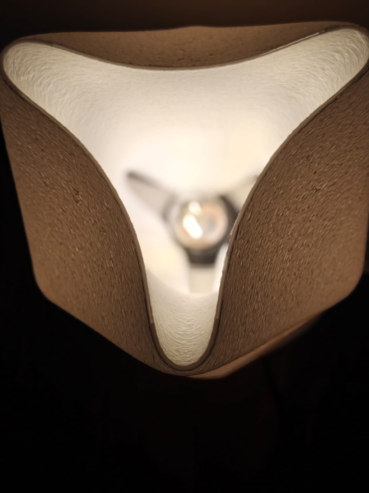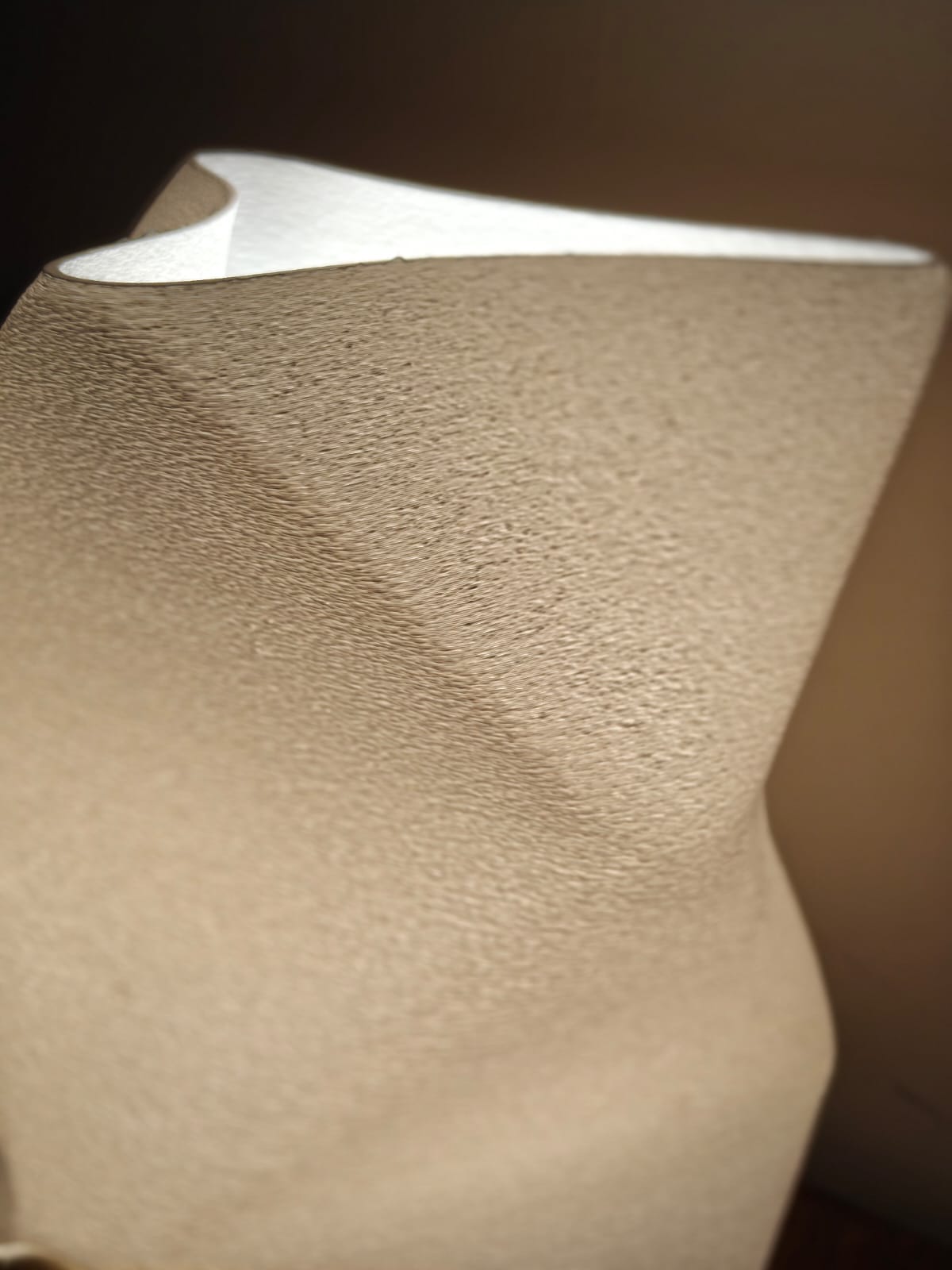 Its flowing silhouette rises from three softly curved “legs,” merging upward into a seamless, continuous shell. The textured exterior mimics natural materials like linen or handmade paper, while the smooth inner surface glows beautifully when lit, creating a warm, enveloping ambiance. The asymmetric, folded geometry adds a sense of organic tension: from some angles it feels like a soft fabric frozen mid-drape, and from others, a contemporary ceramic sculpture brought to life.